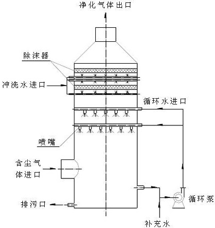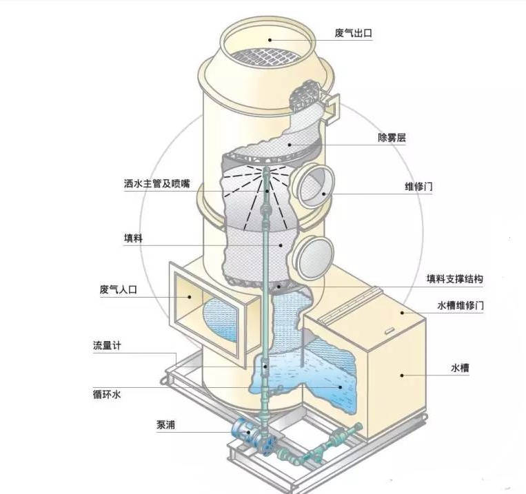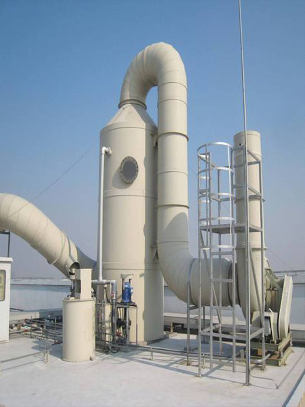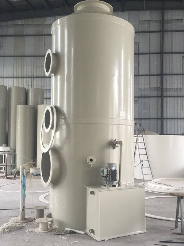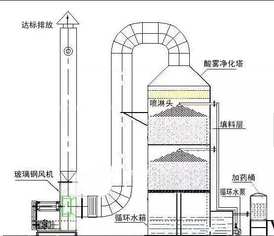 酸霧廢氣由風(fēng)管引入凈化塔,經(jīng)過(guò)填料層,廢氣與氫氧化鈉吸收液進(jìn)行氣液兩相充分接觸吸收中和反應(yīng),酸霧廢氣經(jīng)過(guò)凈化后,再經(jīng)除霧板脫水除霧后由風(fēng)機(jī)排入大氣。吸收液在塔底經(jīng)水泵增壓后在塔頂噴淋而下,最后回流至塔底循環(huán)使用。凈化后的酸霧廢氣達(dá)到廣東省地方排放標(biāo)準(zhǔn)的排放要求,低于國(guó)家排放標(biāo)準(zhǔn)。